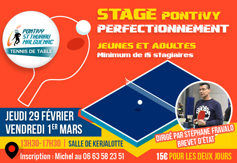 Le club organise un stage à Pontivy avec Stéphane Fravalo le jeudi 29 février et vendredi 1er mars 2024 de 13h30 à 17h30.